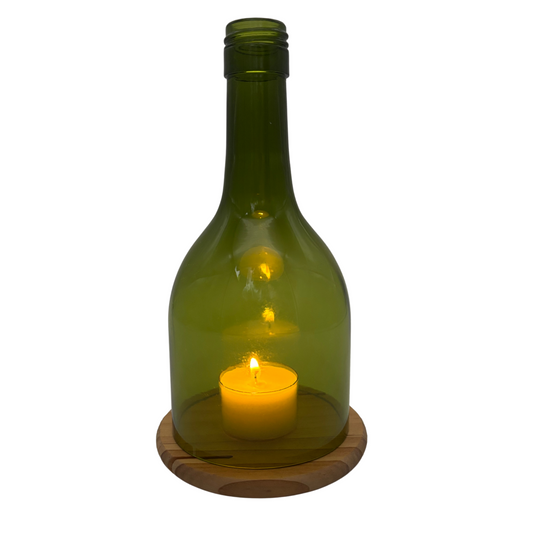 Teelichthalter handgefertigt grün Glas 20x8,5cm + Kerze 6h + Holzuntersetzer